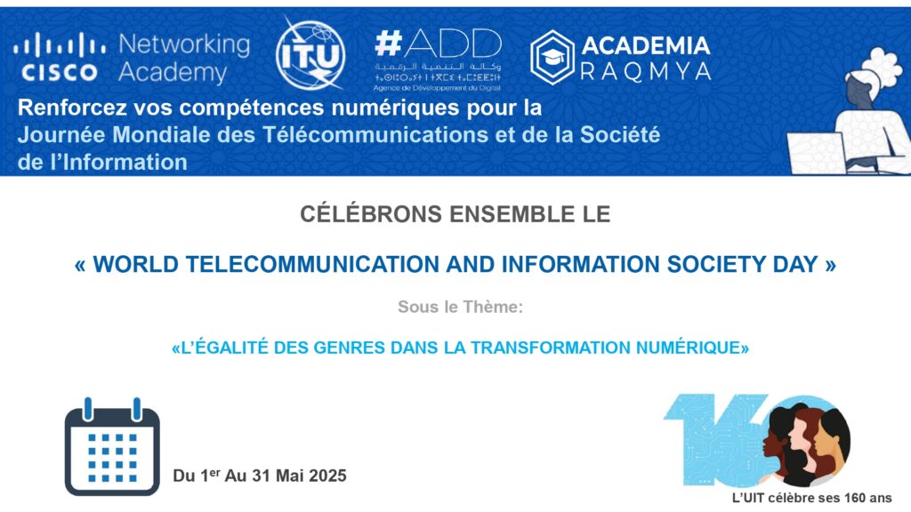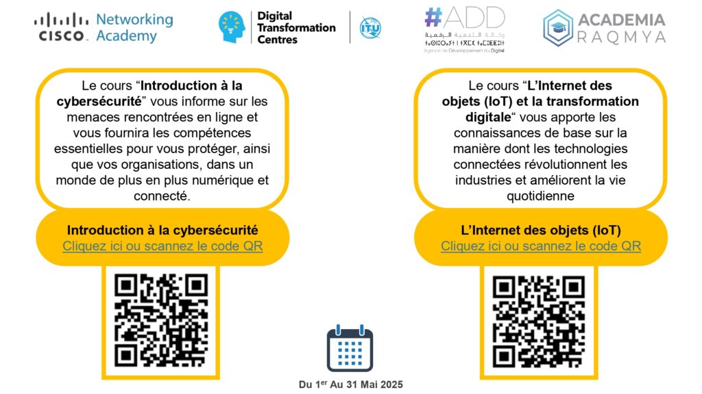 Dans le cadre de son partenariat avec Cisco et le réseau mondial des Centres de Transformation Digitale (CTD) relevant de l’Union Internationale des Télécommunications (UIT), Academia Raqmya met à la disposition de sa communauté d’apprentissage, du 1er au 31 mai 2025, les deux cours suivants :
