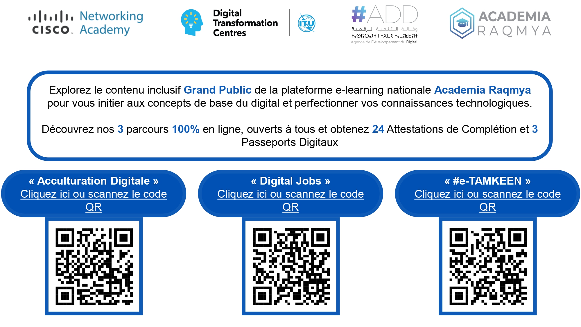Par ailleurs, les utilisateurs sont invités à profiter du contenu inclusif « Grand Public » proposé sur la plateforme Academia Raqmya, accessible en ligne et ouvert à tous. Trois parcours sont disponibles : Lien des trois parcours