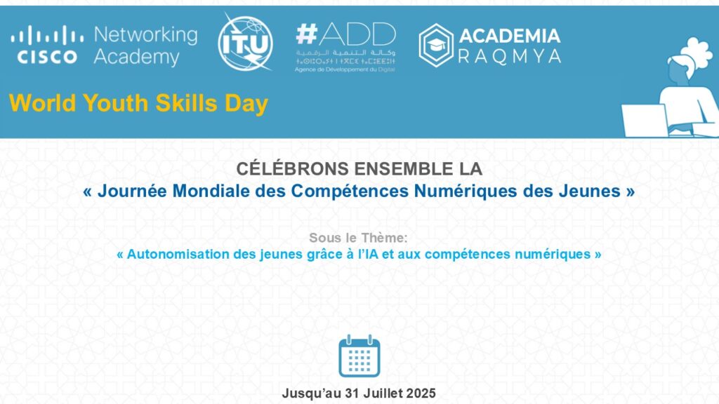 À l’occasion de la Journée Mondiale des Compétences Numériques des Jeunes, célébrée chaque année le 15 juillet, l’Agence de Développement du Digital lance, en partenariat avec Cisco et le réseau mondial des Centres de Transformation Digitale (DTC) de l’Union Internationale des Télécommunications (UIT), une initiative visant à renforcer l’employabilité des jeunes à travers le développement de leurs compétences entrepreneuriales et digitales.