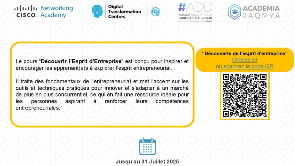 Dans ce cadre, un accès gratuit et exclusif est offert, jusqu’au 31 juillet 2025, au cours en ligne « Découvrir l’esprit d’entreprise » : Lien de la session
