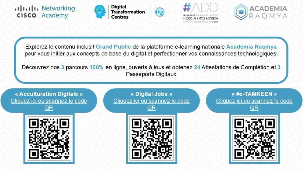 En complément, les jeunes sont invités à explorer le contenu inclusif du parcours « Grand Public » proposé sur la plateforme nationale d’e-learning Academia Raqmya. Ce programme de formation 100 % en ligne et accessible à tous comprend trois parcours structurés :