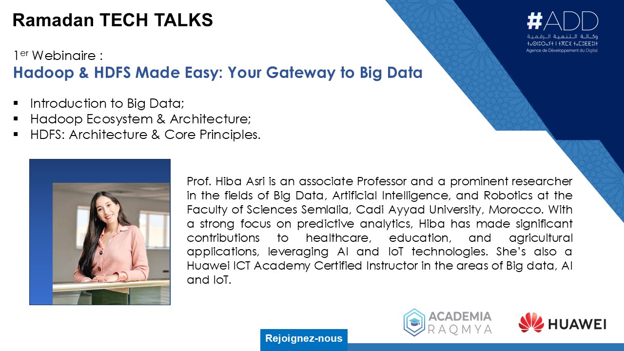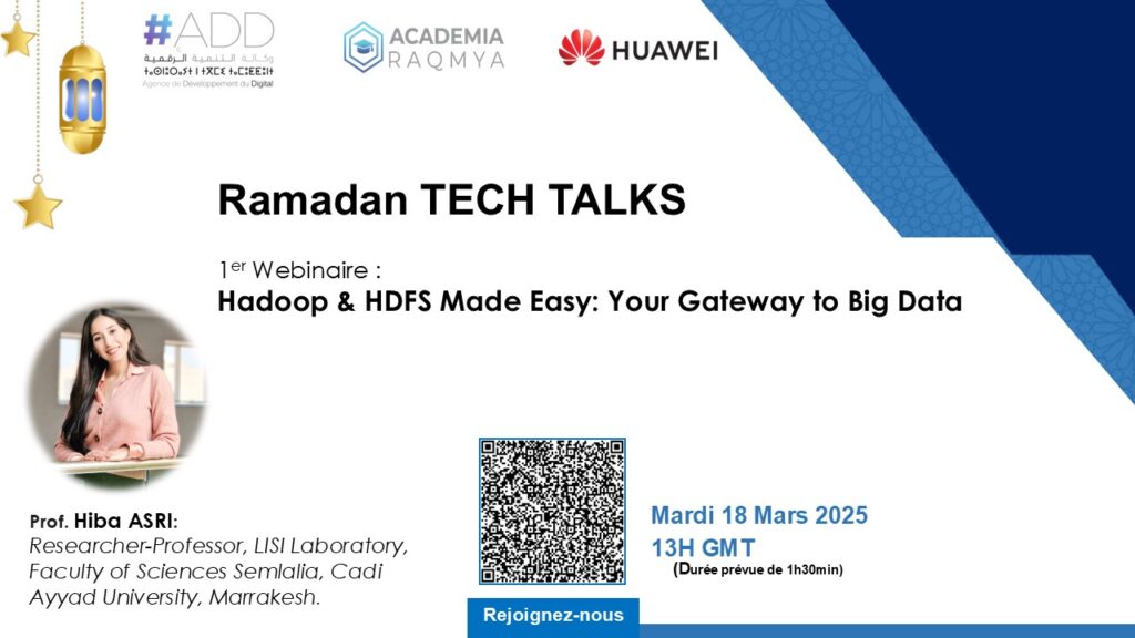 Le premier webinaire, organisé en collaboration avec Huawei ICT Academy, porte sur le Big Data. Il permettra aux participants d’approfondir leur compréhension de Hadoop et HDFS, d’explorer les fondamentaux du Big Data, et de découvrir les bonnes pratiques et outils essentiels pour une gestion efficace des données massives.