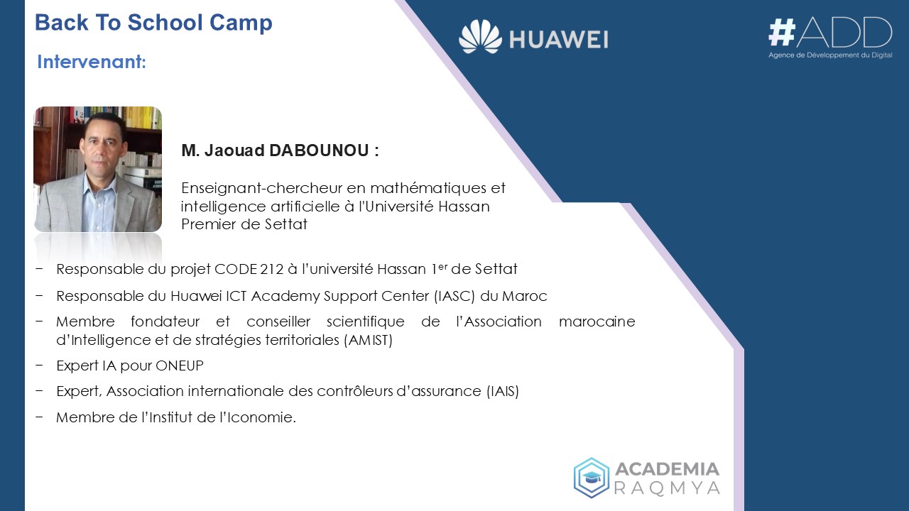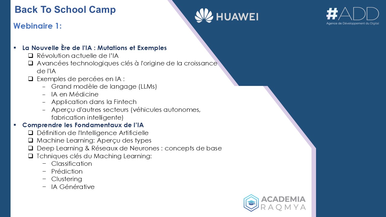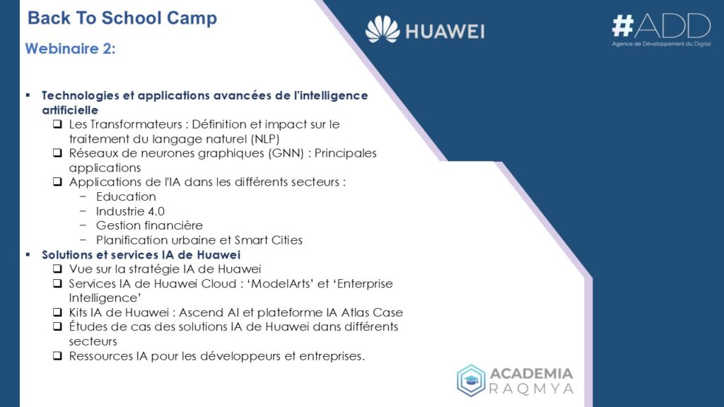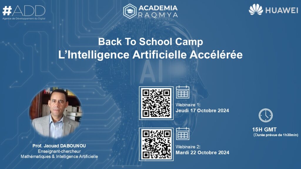 Dans le cadre du programme Back To School Camp 2024, la plateforme e-learning nationale Academia Raqmya, en collaboration avec Huawei ICT Academy, organise deux webinaires exclusifs dédiés à l’Intelligence Artificielle (IA). Ces événements offrent une occasion unique aux apprenants d’Academia Raqmya d’approfondir leurs connaissances sur les technologies émergentes et de comprendre l’impact de l’IA sur l’innovation et la transformation digitale.